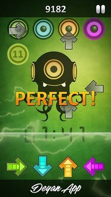 2.游戏的画面只有一个很酷的章鱼怪,每首歌播放的时候都能看到。而且要点击的logo设置成了上下左右箭头的样式,游戏的过程就像手指在玩跳舞机。