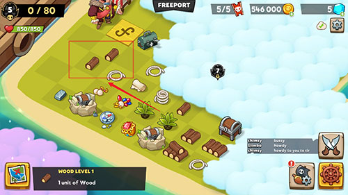 3、再回到船上,点击帆船图标后,点击木材或绳索旁的下箭头即可收集;