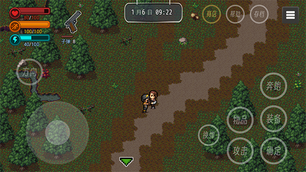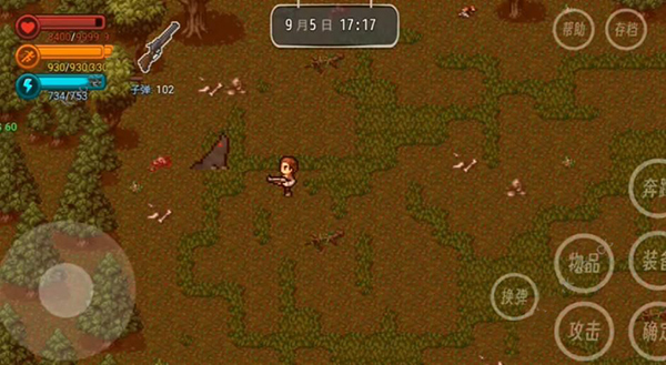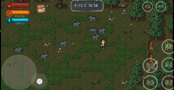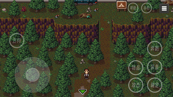 2、我们可以通过左下方按钮控制角色移动,右边包括物品、攻击、奔跑、装备、确定、帮助和存档等功能选项,