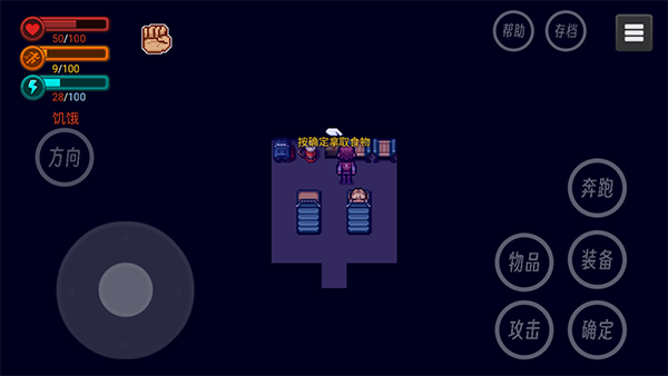 3、场景中会有物品和食物可以拾取,靠近后点击确定按钮就可以放入到背包中,