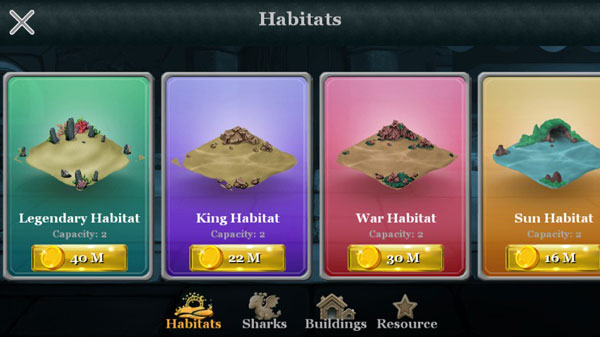 2、栖息地,鲨鱼,房屋,资源的建造生成,为鲨鱼的生存营造更好的环境,而且这些栖息地中的鲨鱼还能为你带来不错的收益哦。