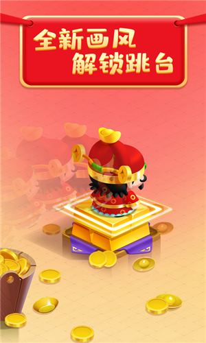 财神跳一跳画风Q版可爱,玩家将操控财神进行跳跃闯关,我们需要适合注意平台的远近,控制自己的跳跃情况。