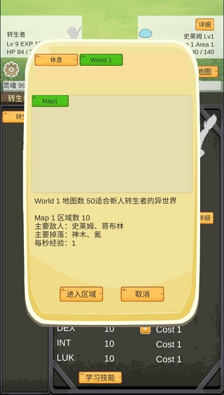 3、有了转生者,你可以在屏下左侧栏查看转生者的能力,接着就是把他分配到异世界去。点击屏上右下角的“选择地图”按钮,并且选择World1和Map1。