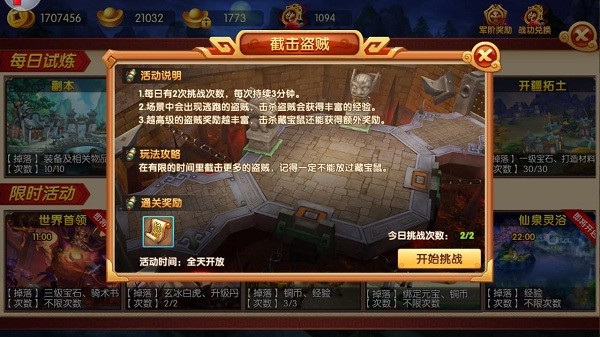 玩家开启截击盗贼副本后,每天可挑战2次,挑战结束后可获得大量的经验奖励,等级越高,每次副本结束后获得的经验越多;而21级时开启的仙泉灵浴活动是个休闲的好去处,每天晚上22:00开启,每在浴池中停留一段时间,便会获得经验值,偶尔还会有概率获得额外的奖品;当等级达到23级后就可以参加个人押镖活动,每天中午和晚上开启两次,每人每天最多可押送3次个人镖车。护送镖车安全到达终点就可以获得丰富的经验奖励。