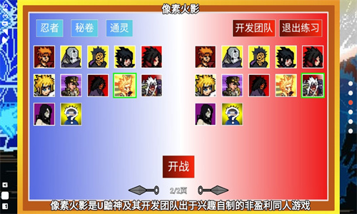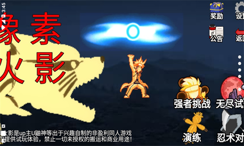 像素火影luogai是一款玩家自制的同人动作格斗游戏,在这款游戏中,玩家能够扮演自己喜爱的火影角色,能够体验单机模拟,完成各种任务,还能与全球玩家一决高下,并且这里为各位收集各种角色,如承太郎、大蛇丸等,并使用奖励解锁新的角色,让每场对战都充满变数与深度。总体来说,这款版本带来全新优质改版,确保各位能体验最经典的火影对决玩法。