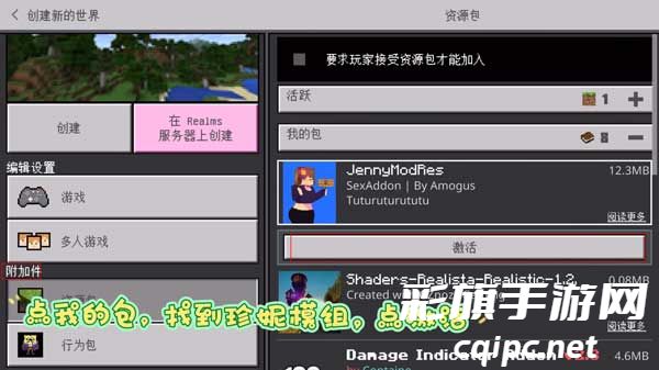 5、然后就是找到附加件,将资源包和行为包中的珍妮模组进行激活,激活之后就能开始游戏了。