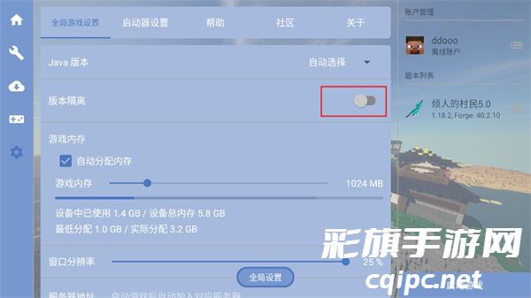 5、如果没看到村民版本的话来到设置里打开版本隔离,重启游戏。