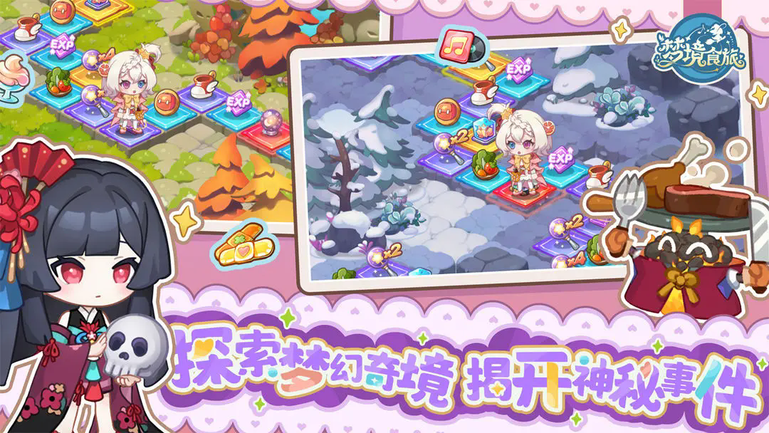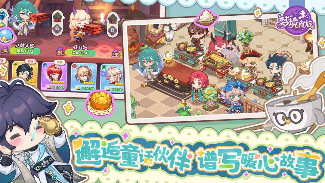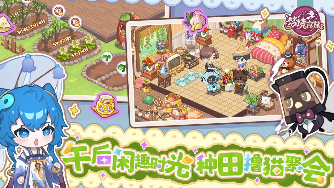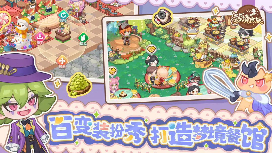 梦境食旅手游融合了餐馆经营、员工收集、战斗和趣味小游戏等多种玩法,玩家可以制作食物,研发或寻找来自世界各地的美味食谱,也可以和来来往往的奇怪顾客进行互动,聆听各种各样的小故事,还可以招募各种员工和异世界的伙伴,如红皇后、青蛙王子、小红帽和姜子牙等,一起经营或展开冒险。