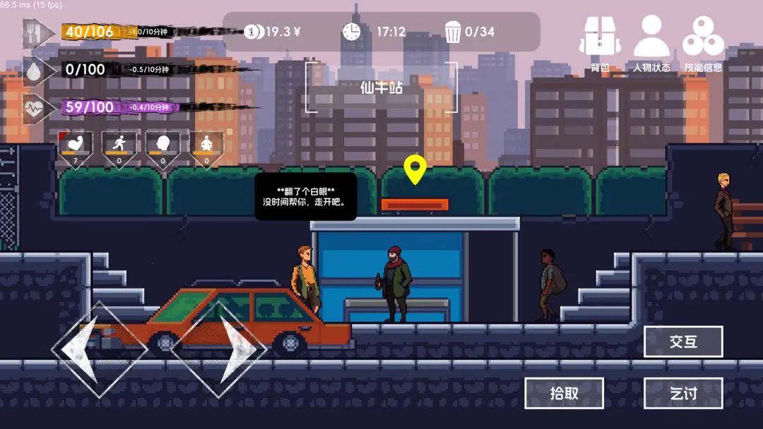 2、开局往左走,一路乞讨+翻垃圾桶,垃圾桶翻到吃的不要吃,很容易生病,治病花钱多,不划算。