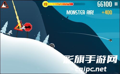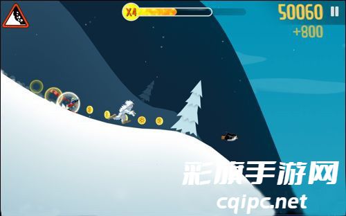 4、滑雪时有多种环境场景可供使用,各种动物和道具可以帮助你跑得更远。