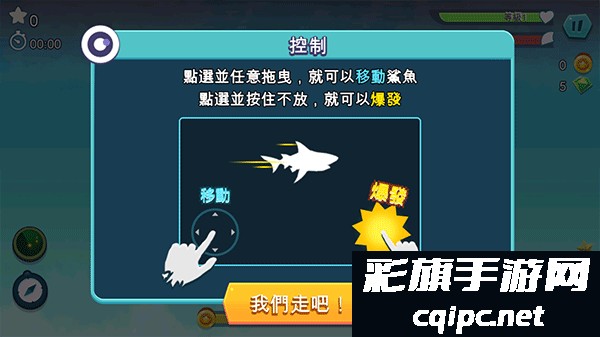 2、我们先熟悉下操作,点击并任意拖拽,就可以移动鲨鱼,点击并按住不放,就可以爆发;