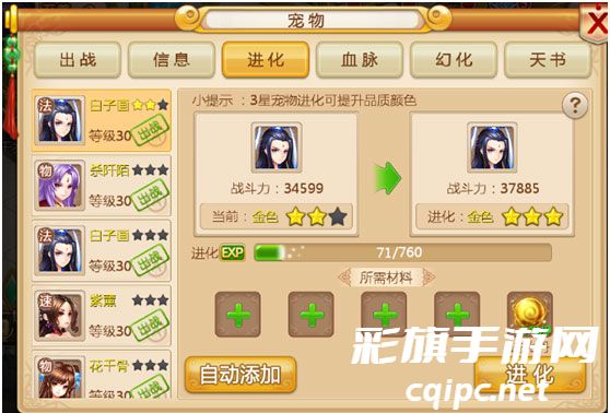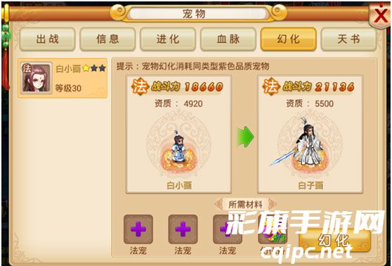 宠物的进化需要非常多的宠物口粮以及进化丹,宠物口粮可以再寻宠的染竹密林和绝谷悬崖获得,进化丹可以再通天塔中获得。