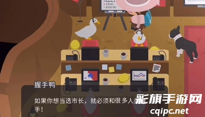 2、接着和握手鸭学习如何握手然后去城镇找到三十个头上有黄色感叹号的人握手。