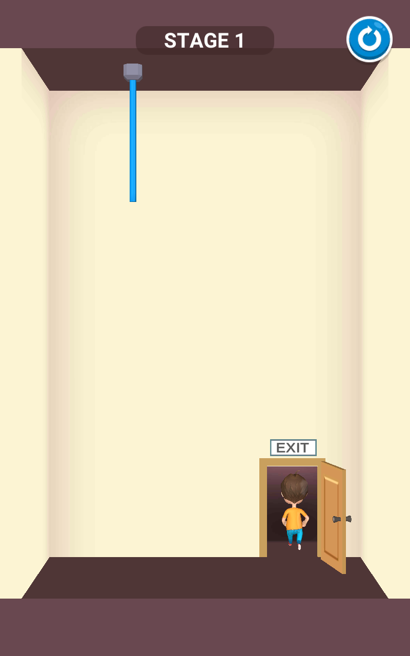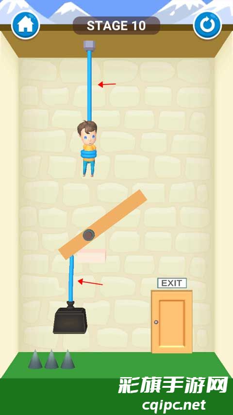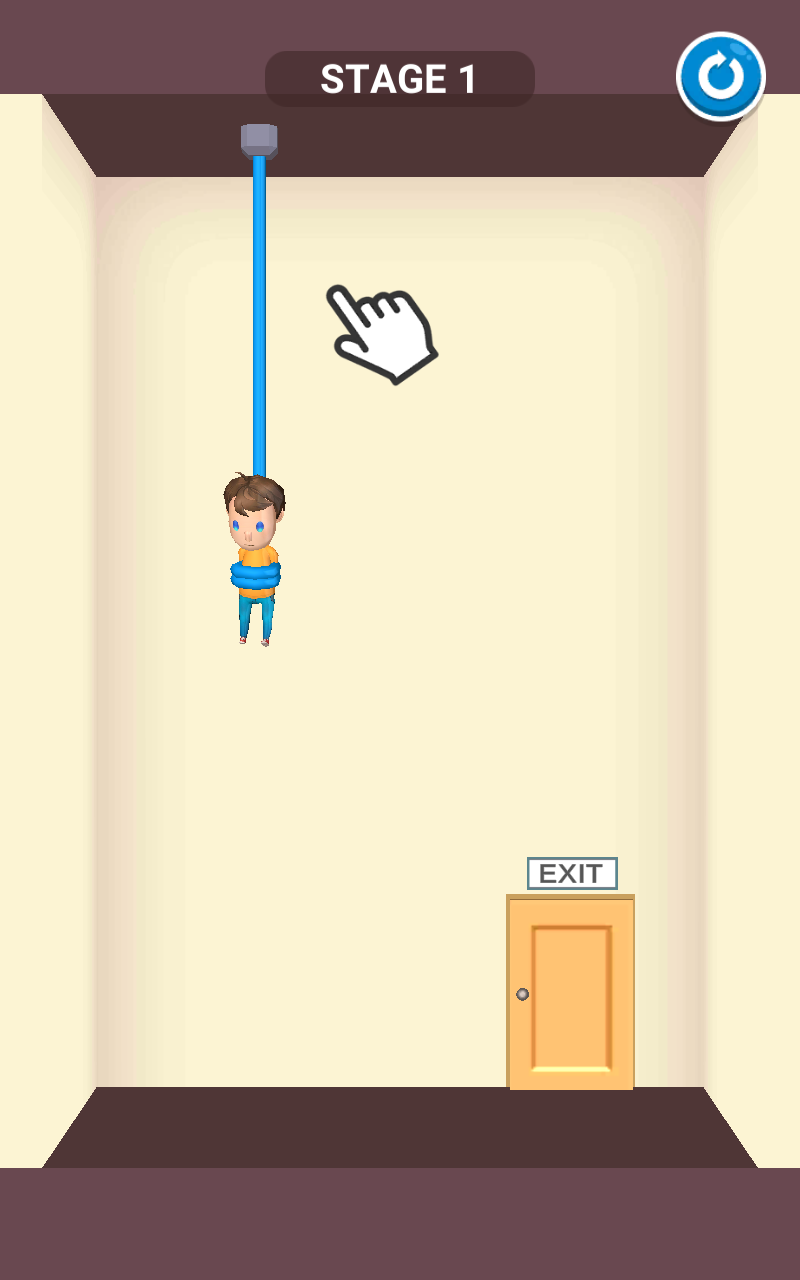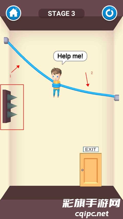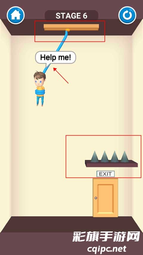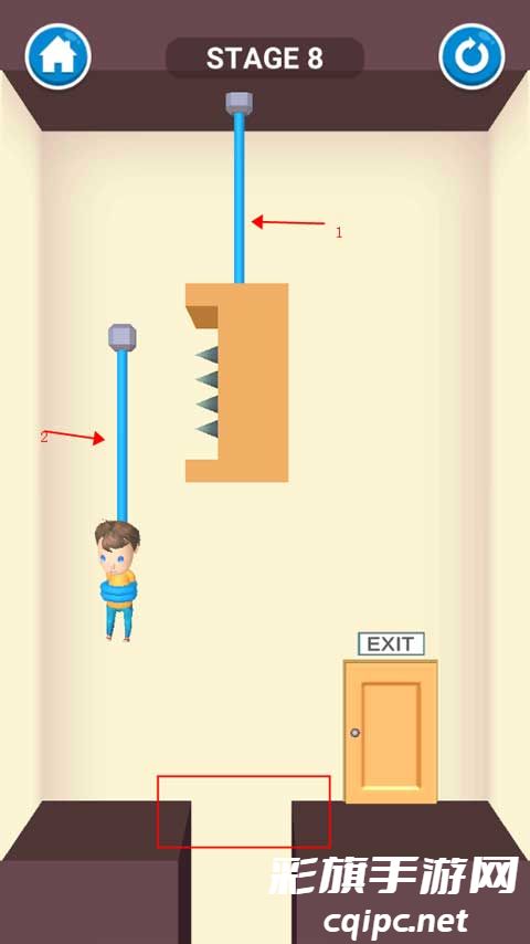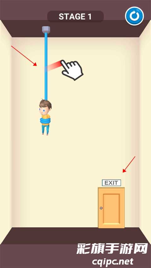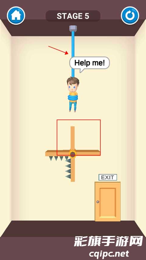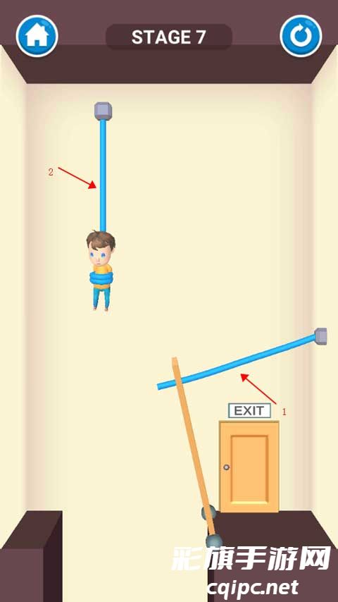 这关卡只是简单的用手指划过吊起小男孩的绳子,小男孩被解救之后就会自动走到出口,关卡通过。