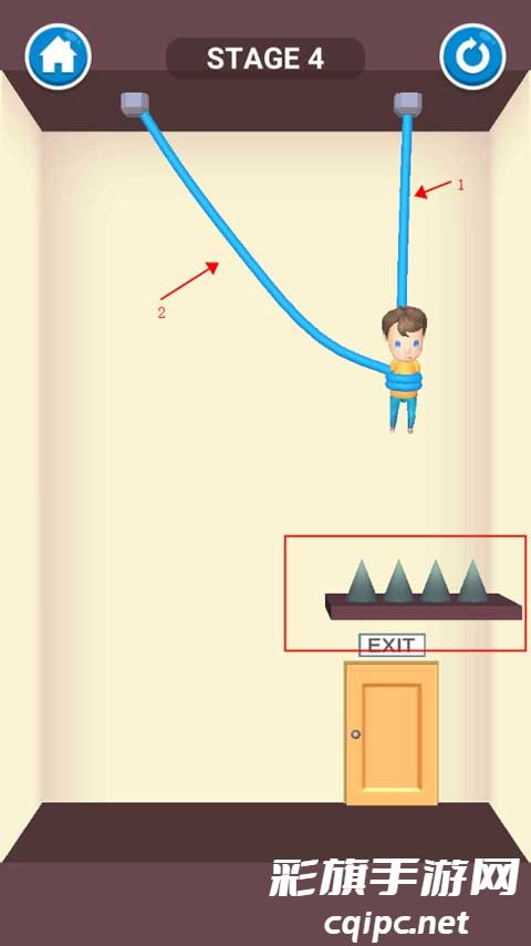 这次的尖刺放置在小男孩的下方,一旦检错绳子,就会死亡,玩家将不会得到金币兑换皮肤。这次还是按照我标注的顺序来剪绳子。