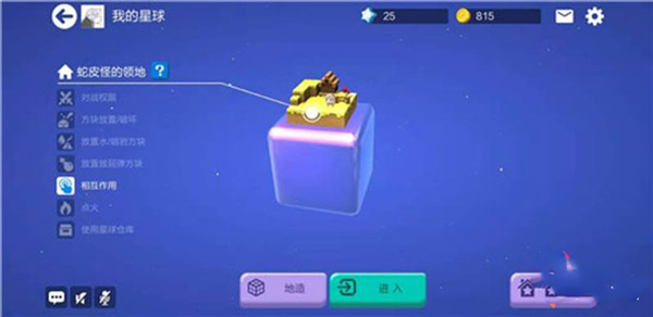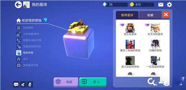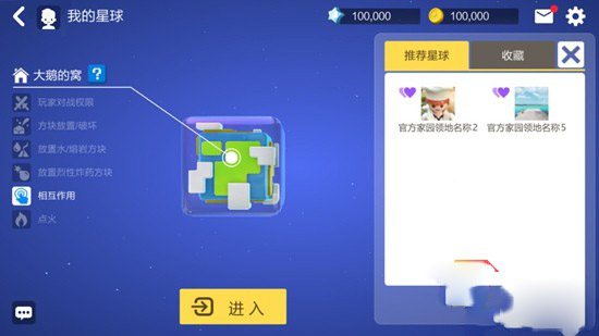 在从平原、荒野、沙漠中选择你中意的,给你所在的星球起一个好听的名字,设置进入权限、破坏权限。将你的星球打造成你所中意的样子,或是在“推荐家园”中看看其他玩家的作品。如果你的星球足够有特色,也有机会获得官方的推荐哦。