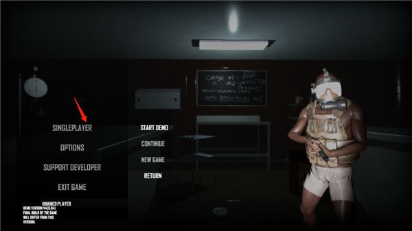 1、进入scum人渣手机版,等待几秒进行游戏加载,然后正式进入游戏首页,点击单人游戏,里面提供了游戏演示、继续和新游戏,我们点击开始演示;