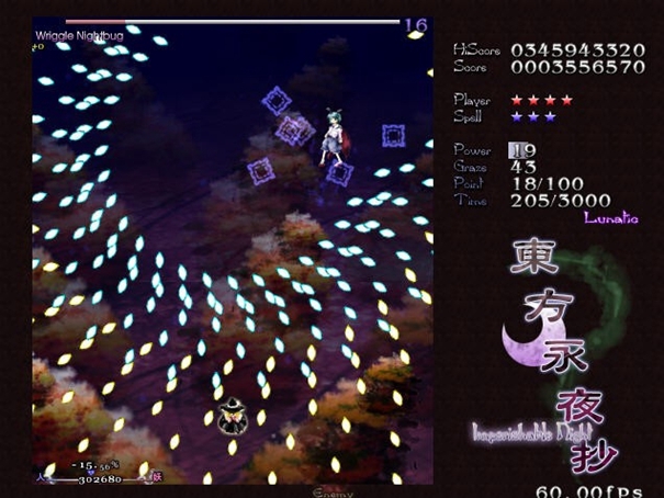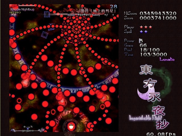 6、然后就进入游戏了,Z是发射子弹,X是BOMB,还有SHIFT键(按住),是切换人物,按住SHIFT键后一般移动速度都会慢一些,另外就是在你的机体中心出现一个白点,此点为判定点,此点不被命中时,你不会有事。