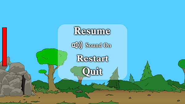 2、游戏菜单的四个选项分别是:返回游戏、声音开关、重新开始、退出游戏。