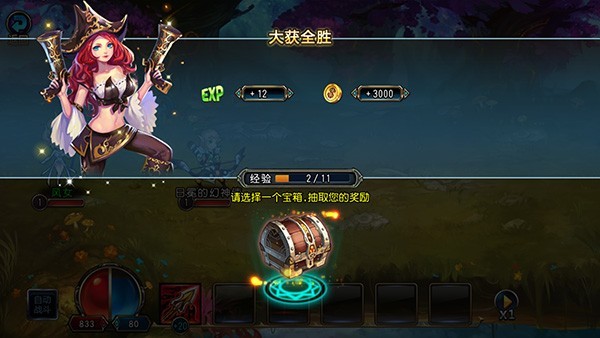 3、战斗奖励:胜利后获得宝箱,可抽取奖励。
