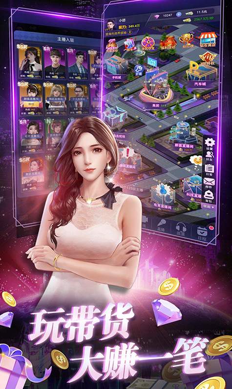 1、进入游戏后,会有一段背景故事。主角以前只是一个平民,但他有一个做主播公司的梦想。一次偶然的机会中了10w,于是他开始了创业的生涯。