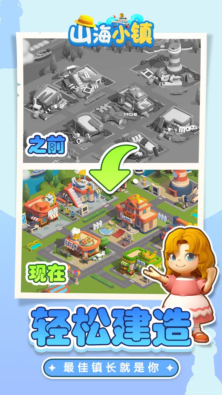 1. 山海小镇是一款卡通经营建设手游。在游戏中,玩家可以通过掷骰子获得金币和木头,并使用金币和木头来解锁城镇中的商店进行商业经营。