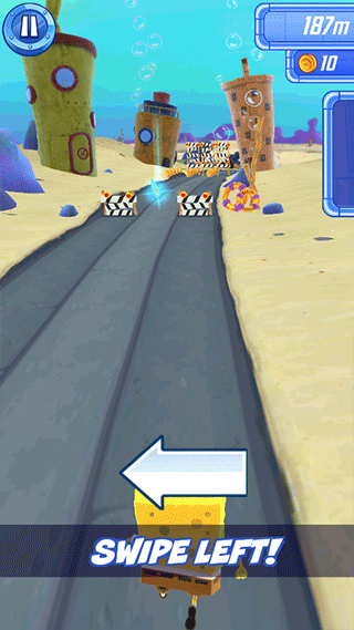 3、向左滑动,可以移动海绵宝宝到左边躲避障碍;