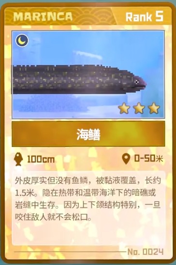 捕捉方法:因为海鳝只在晚上出现,所以要晚上再去,一般可以在蓝洞入口附近30米左右的海域找到,找到后使用催眠枪击晕它就可以捕捉到了。