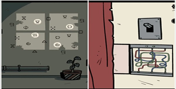 10、往右转点击窗户关上窗帘,然后使用手套完成右边的线路拼图并打开上面的开关。接着到划叉的门那里,将开关装在房间电灯的电源线上,关掉灯光后观察墙上的提示。