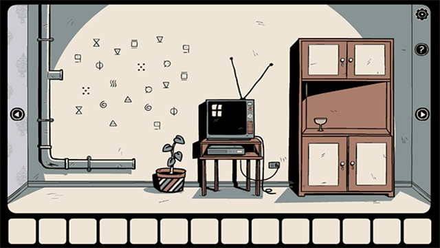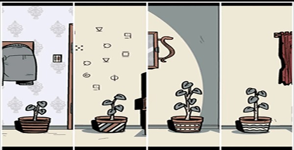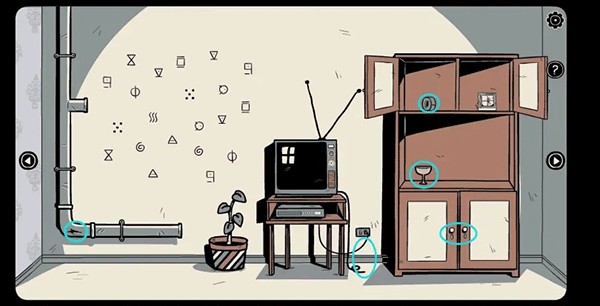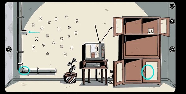 3、接着再往左走拿走架子上的「笔记本」和花盆里的「石头」,然后观察上面的提示,并将获得的纸条放在上面。根据笔记本上的提示打开下面的柜子(注意符号顺序会有所变化)获得「镜子」。