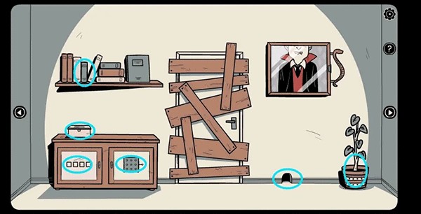 15、观察吸血鬼对其反应后出现的提示,然后按顺序输入并打开相框后面的保险箱,最后拨动保险箱里的开关打开大门,出去后游戏结束。