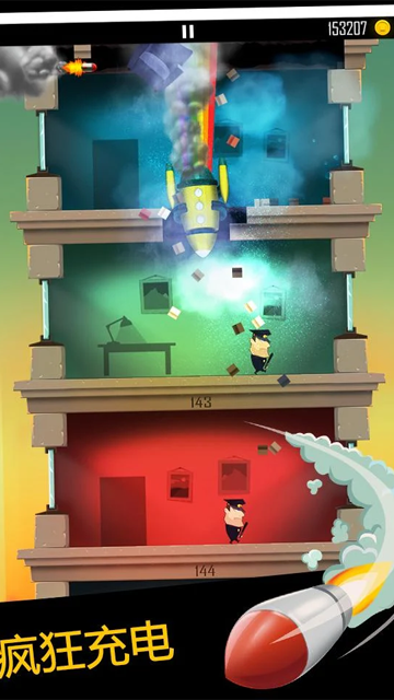 购买超级火箭后,在游戏中会随机出现此道具,碰触即为装备该道具,装备完成,超级火箭把角色载入后,会上升,3秒后掉头进行急速下坠,此时,所有楼层消失,替代的是一段有许多金币的路程;我们左右摇动手机,控制超级火箭到金币正中,获取大量金币;