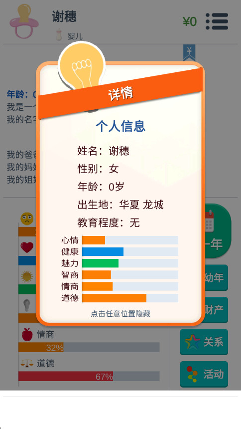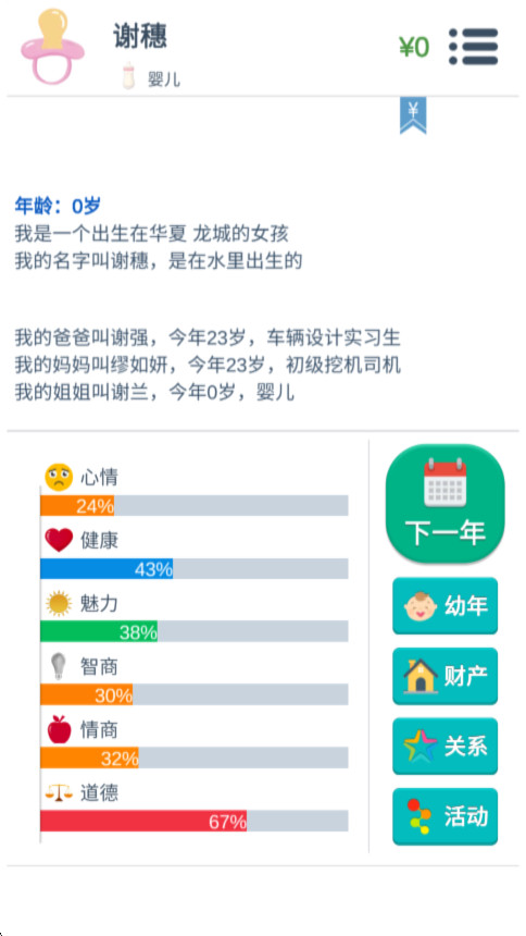 第二人生是一款文字模拟人生游戏。第二人生手游下载玩家将化身“第二身份”,从婴儿呱呱坠地开始,经历求学、工作、婚恋、育儿、养老等完整人生阶段。第二人生以高自由度选择为灵魂,每一次点击、每一次决策都将引发蝴蝶效应,塑造出截然不同的人生轨迹。