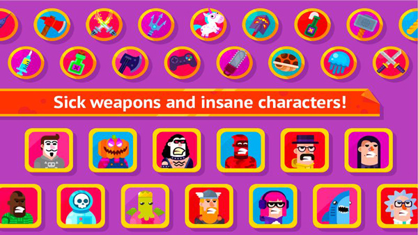 操作很简单:反方向滑动屏幕来决定射出武器的方向和力度,两边各有一条血条,不同的力度或者射中不同的位置会造成不同的伤害,先被清空血槽的一方将会被对手“终结”。