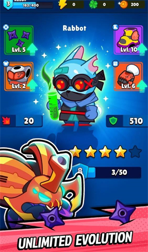 1. 有各种各样的兔子角色供玩家选择和玩,丰富的各种技能可以自由组合,体验不同种类的割草乐趣。
