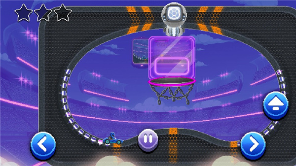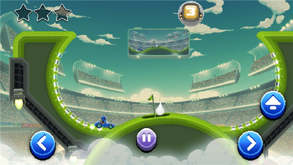 1、玩家需要驾驶赛车在绿地上移动,通过控制赛车的左右移动和跳跃来避开对手和障碍物。