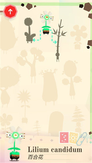 2、按住百合花头顶的红色拉环向下拉动,可以看到植物演化公式,例如下图中,百合花可以演化为左右两种植物,至于怎么让它变化,那就是我们需要去探索和尝试的事情了。点击左上角红色箭头,收回植物演化表