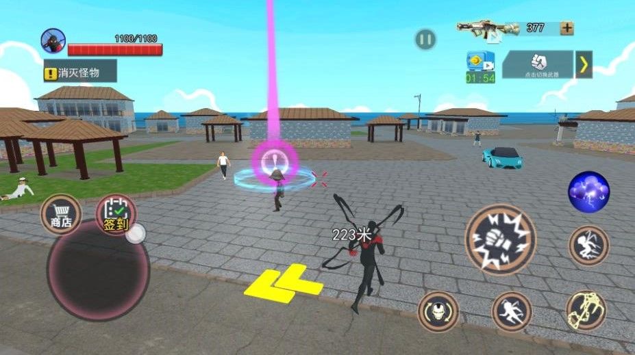 3. 酷英雄保卫城市,解锁各种点和任务,并使用各种武器和车辆来帮助你完成挑战。