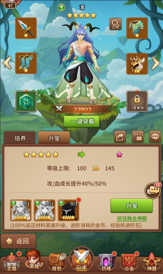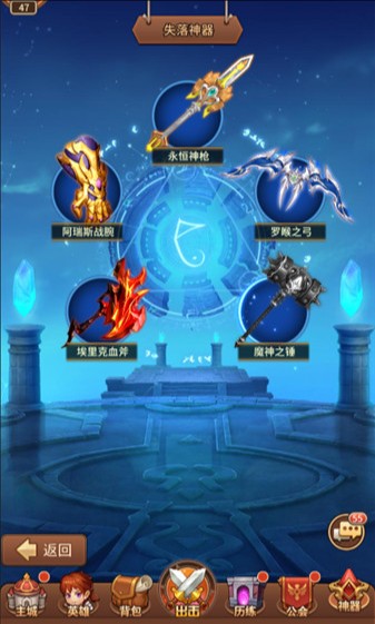 集齐失落在冒险大陆的各种神器后就能进行神器培养了,经过培养的神器将在战斗中提供属性加成,不同的神器还有各自专属的神器技能,让你轻松获得战斗胜利~
