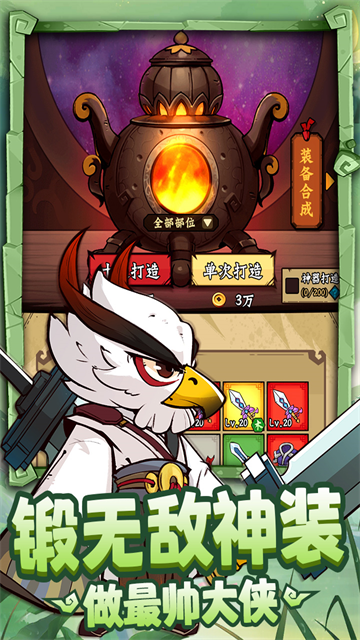 游戏中的装备玩法独特且有趣。装备具有五行属性效果,每件装备属性唯一;既有高基础属性,又有强大的词条效果;装备词条玩法丰富,可打造/合成获取随机词条属性,也可进行词条转移;还可以搭配组合不同的装备效果(基础装备属性套装、技能属性套装,闯关金币套装,挂机金币套装)。