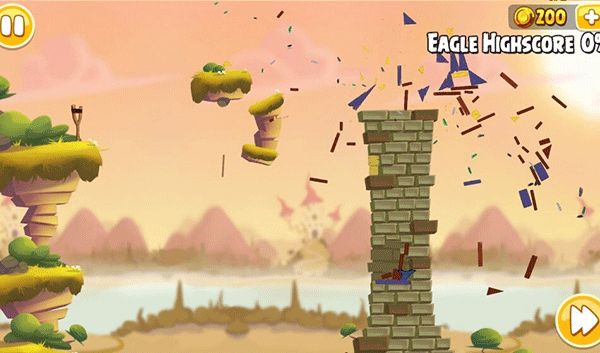 14、第一只鸟击中左下角的位置,让左边的建筑结构倒塌,第二只回旋鸟准确的击中右边木三角底下的木条即可让建筑整体倒塌,灭全猪,拿三星!