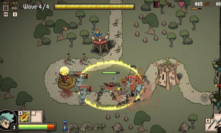 3、我们的目标是保护王国免受敌军的侵害,建造塔楼并使用你的英雄阻止他们,不要让他们到达城堡,玩法和保护萝卜差不多。
