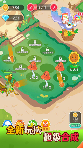 2、轻松拖动,合并升级: 两指间的轻触,相同植物合二为一,轻松打造强力阵容。
