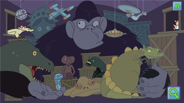 4、将右上蛋糕放在正中弧形红板上,左边的玻璃罩在右下的怪物上,照相机拍右边第2层的怪物,左下圆平台,正中两半圆,半圆旁边平台(2次),正中两半圆,牛的玻璃罩,牛左边的绿钮(2次),中下的红按钮,左上角红色按钮(2次)。