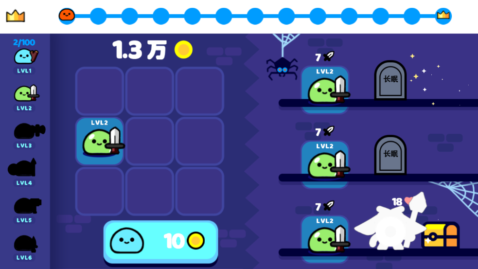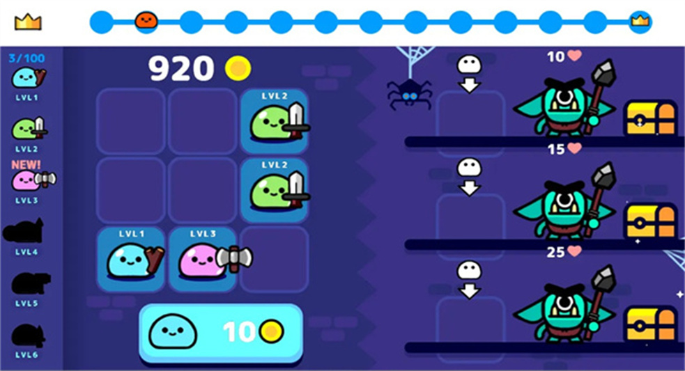 合成吧史莱姆是一个有趣和轻松的合成游戏,它的平面设计非常明亮清新,色彩鲜艳,音效舒缓,营造出轻松的游戏氛围,简单,易于操作,你可以培养和发展数百种类型的粘液,通过自由组合基本元素,您可以生成初级黏液,然后通过碰撞合成解锁稀有形式,有无数的障碍不会让你轻易逃脱,避免锋利的刀片,跳过滚动的木桶,小心地穿过危险的绳索,画面清新,音效逼真,带来非常好的视听体验,为玩家提供轻松愉快的氛围。