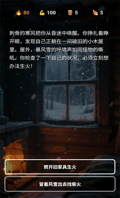 雪山求生是一款基于文本的生存模拟游戏,刺骨的寒风将你从昏迷中唤醒,壁炉里最后的火花即将熄灭,你是雪山事故的幸存者,游戏将专注于创造一个严酷的雪山环境,具有寒冷的温度,强烈的暴风雪和其他天气条件,没有传统的图形或操作界面,剧情发展完全由文本叙事驱动,通过选择不同的行动策略,可以影响角色的生存状态,在多个结局设置中,玩家做出的每一个选择都将影响最终的命运。