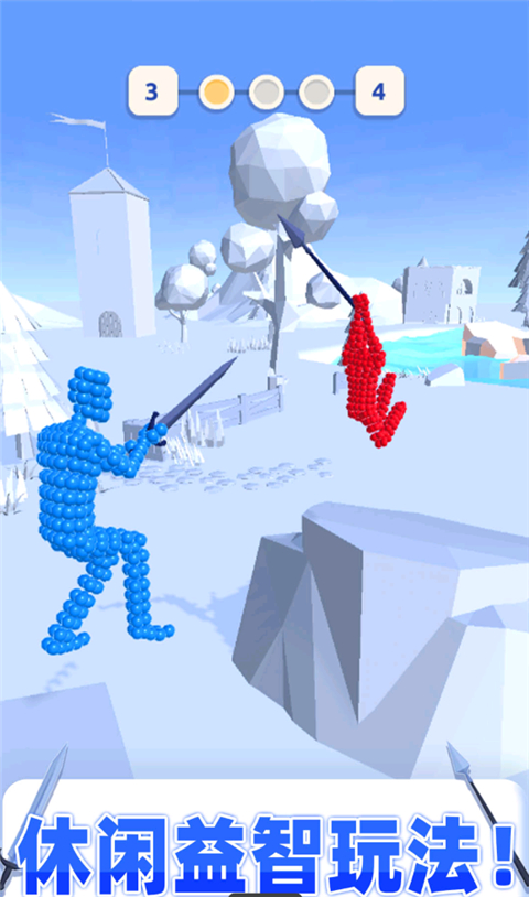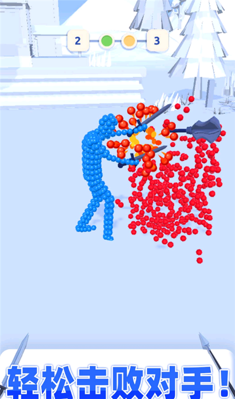 点击进攻后,小人会拿着武器用摆好的姿势与对方决斗,武器越早碰到对方的一方获得游戏的胜利!