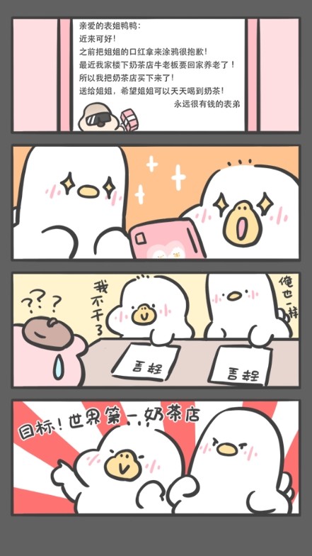 胖鸭奶茶店是一款充满乐趣的模拟经营游戏,游戏采用了Q版卡通画风,游戏内容丰富多样,操作简单有趣。玩家在游戏中扮演一位奶茶店老板,你将和胖鸭一起经营一家奶茶店,玩家需要通过不同的材料制作出不同的奶茶,吸引更多的顾客,赚取更多的钱。如果你喜欢这款游戏的话,就快来下载,将你的奶茶店开遍全世界。