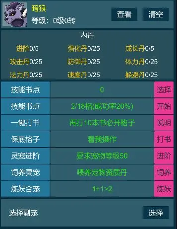【炼妖】是专门针对灵宠提升的页面、在此可以用兽决修改灵宠技能,并有几率直接扩充灵宠技能格子,通过饲养提升灵宠资质和成长,直接加强灵宠战斗力。更可以进行合宠操作,达到1+1>2的效果。