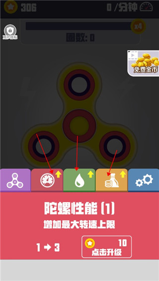 3、也可以用金币升级陀螺,提升他的性能、润滑度等数值,让他变的更加持久